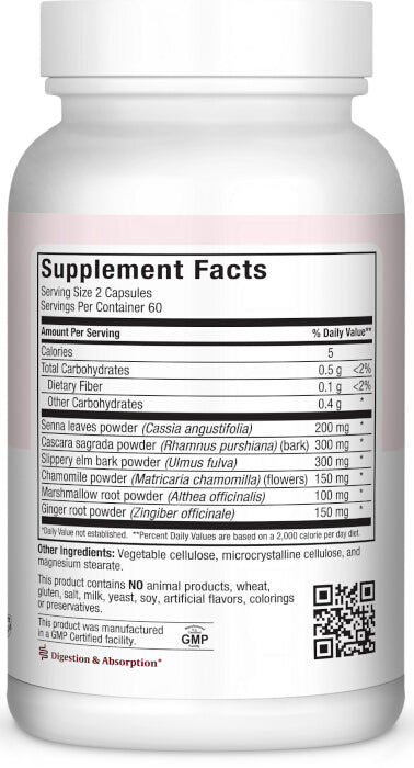 - Senna leaves, Cascara sagrada, Slippery elm bark, Chamomile, Marshmallow & Ginger