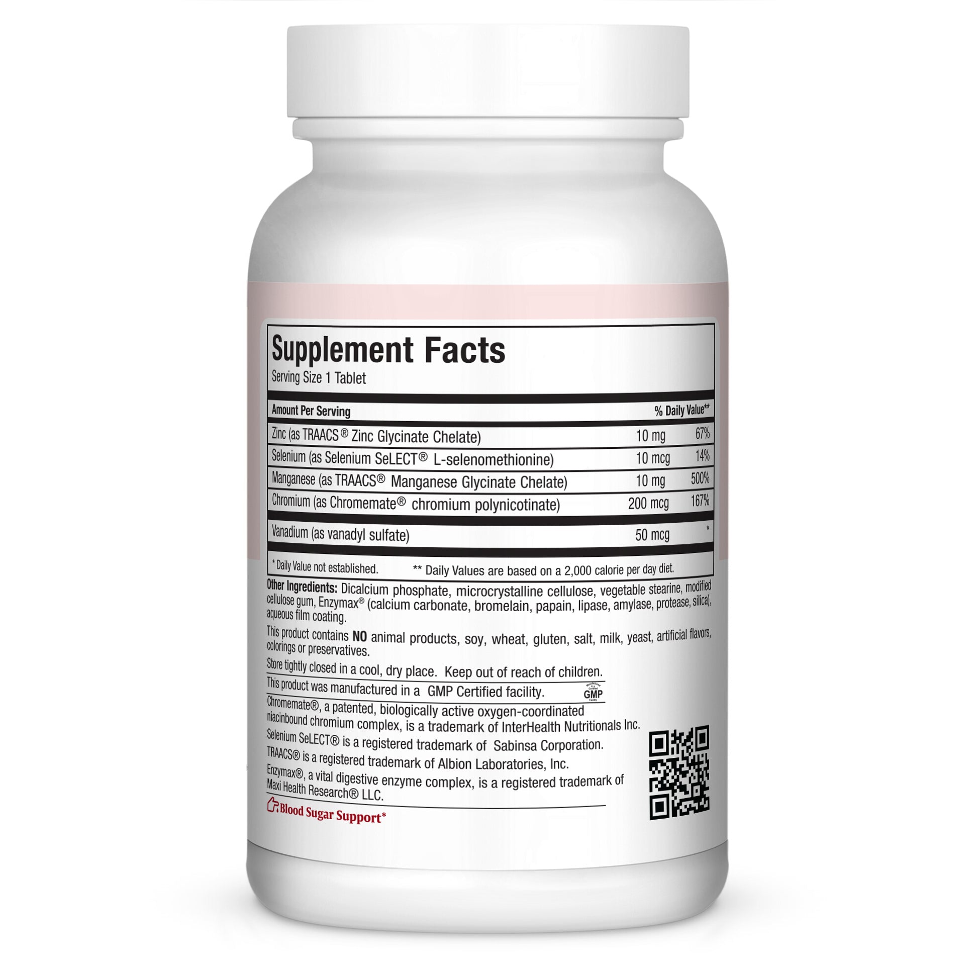 Zinc (as TRAACS® Zinc Glycinate Chelate) is a component in support of insulin. It is required for DNA synthesis, critical to cellular replication organ and tissue cells involved in maintaining healthy blood sugar levels.