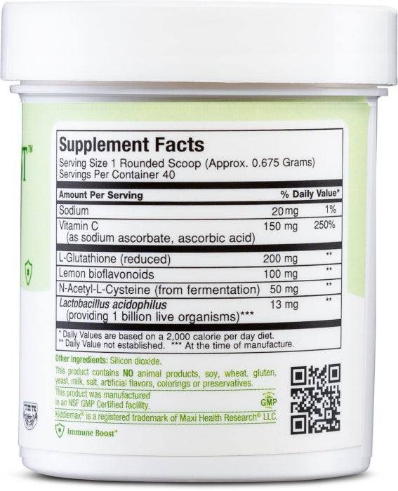 Kiddie Boost™ is our unique product formulated with children in mind. It combines the health benefits of non-acidic vitamin C, L-Glutathione, N-Acetyl Cysteine, and lactobacillus sporogenes into one great product.