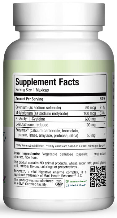 To enhance NAC’s antioxidant and other helpful benefits we added Selenium, Molybdenum and L-Glutathione. Our Maxi NAC Complex offers you support for liver detox, mucous, mood and behavior issues. It is also a great antioxidant!