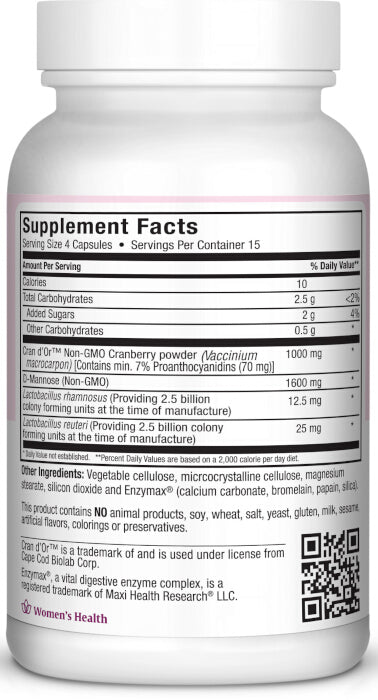D-mannose is a simple sugar occurring naturally in many plants. Cran d'Or™ is more effective than cranberry juice because it gives you the benefit of the entire cranberry including the fruit, seeds, skin, fibers, and juice. We added two types of Lactobacillus to support recovery and maintenance.