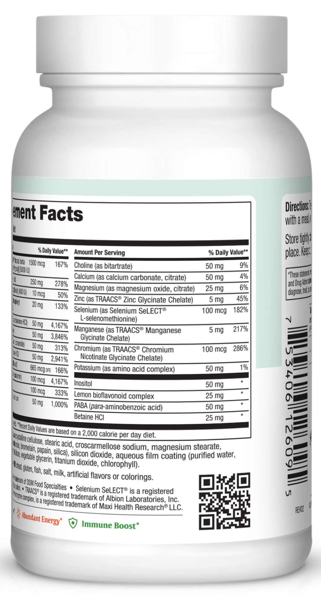 Is a one tablet per day vitamin without iron what you want? Maxi-Health Research® is proud to bring you the ultimate daily multi with minerals for maintaining good health. Maxivite™ is a well-balanced daily supplement containing the appropriate levels of vitamin A,B,C, D and the E vitamins with a number of chelated essential minerals.