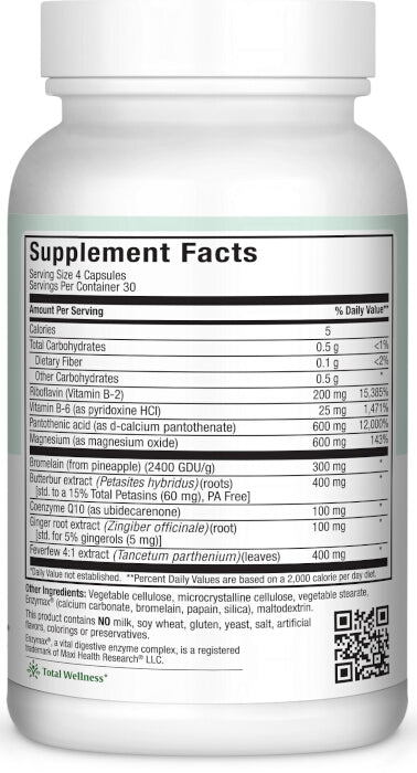 Migraine Max™ has 9 active ingredients that are safe and gentle. Feverfew extract, CO Q10, magnesium, butterbur (now PA free), riboflavin, ginger, vitamin B6, bromelain, and pantothenic acid (vitamin B5).