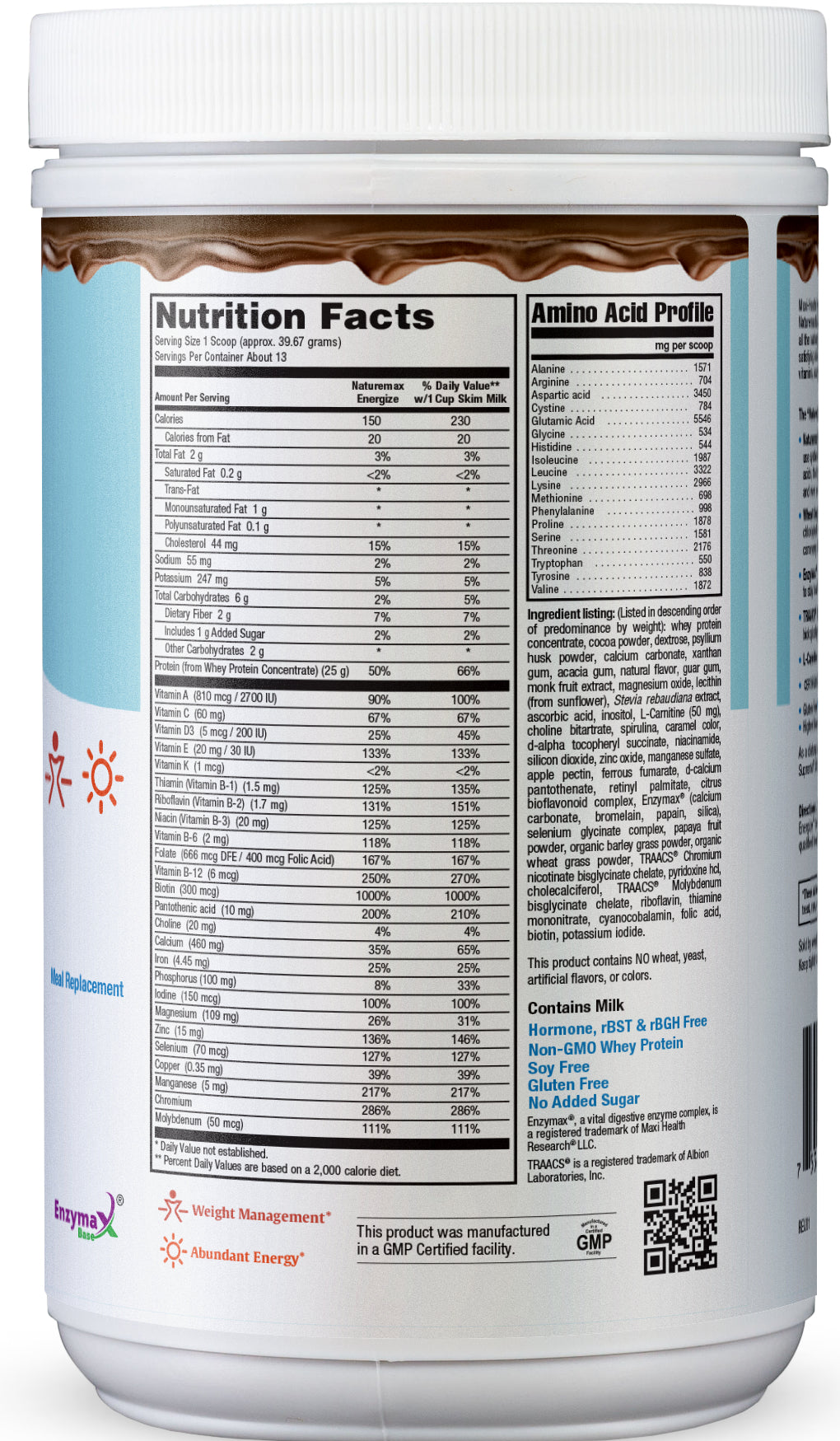 Naturemax Energize™ - Natural Chocolate flavor is professionally formulated to provide you with all the nutrients you need to stay healthy and fit. It’s a delicious chocolate drink enriched with easily digestible whey protein, fiber, enzymes, amino acids, vitamins, essential minerals and powerful antioxidants. It's a great meal replacement for weight management and a muscle builder for fitness enthusiasts. Check out its Amino Acid Profile: