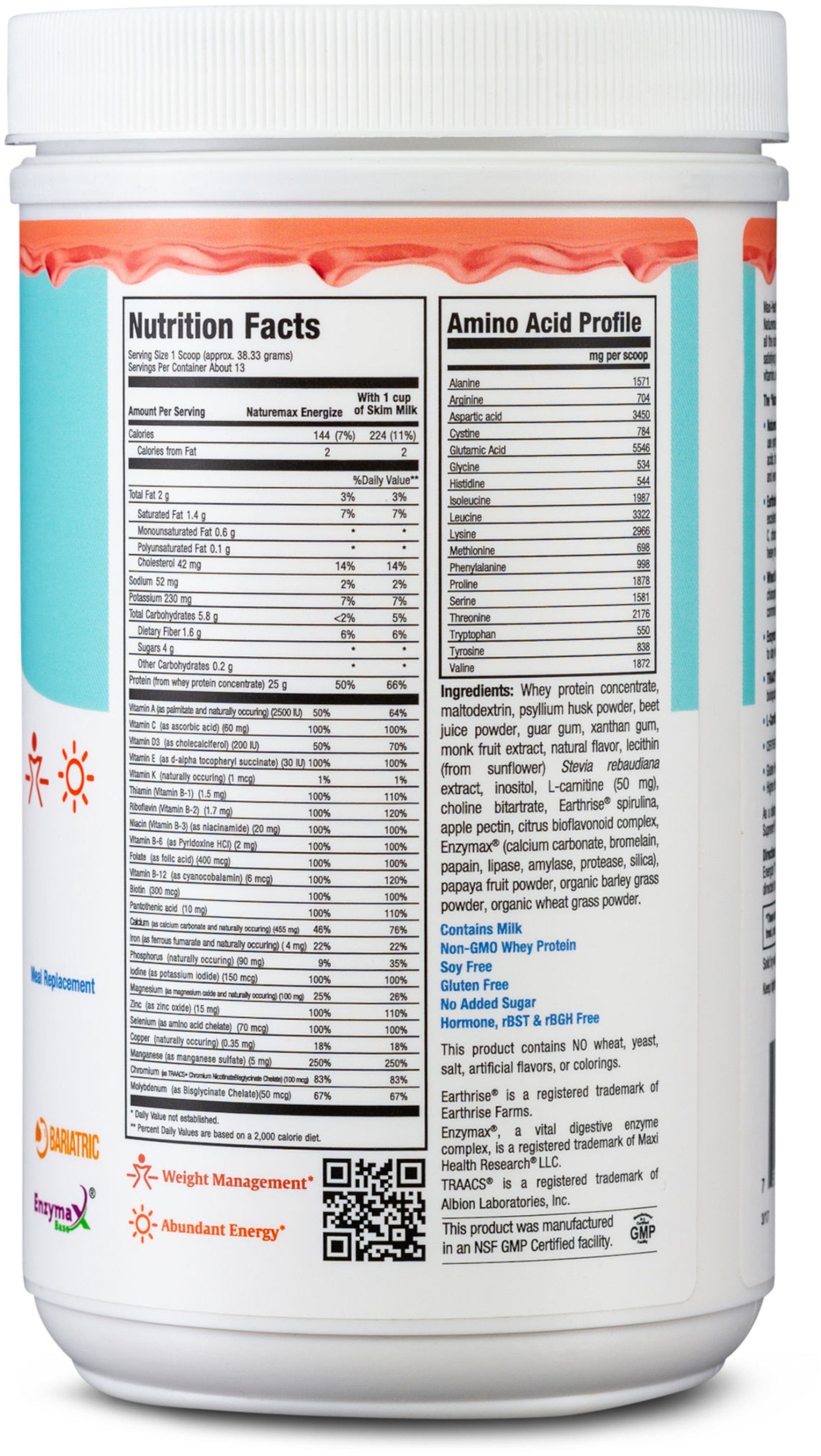 - One serving of Naturemax Energize™ provides 25 grams of whey protein.