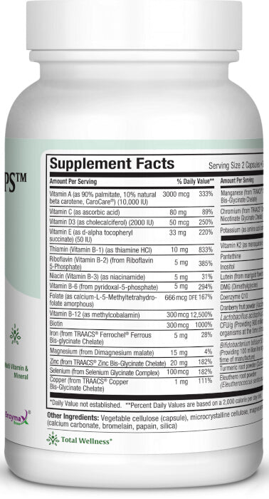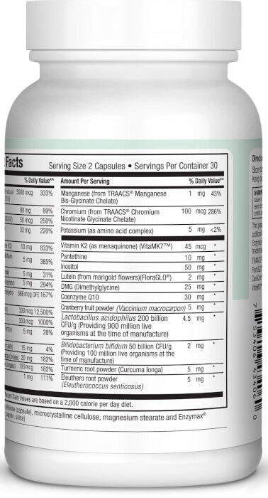 Vitamin A • Vitamin C • Vitamin D3 • Vitamin E • Thiamin (Vitamin B-1) • Niacin (Vitamin B-3) • Vitamin B-6 • Folate • Vitamin B-12 • Biotin • Iron (from TRAACS® Ferrochel® Ferrous Bis-glycinate Chelate) • Riboflavin (Vitamin B-2) • Magnesium (from Dimagnesium malate) • Zinc (from TRAACS® Zinc Bis-Glycinate Chelate) • Selenium (from Selenium Glycinate Complex) • Copper (from TRAACS® Copper Bis-Glycinate Chelate) • Potassium (as amino acid complex) • Vitamin K2 (as menaquinone) (VitaMK7™) • Pantethine • Inositol • Lutein (from marigold flowers)(FloraGLO®) • DMG (Dimethylglycine) • Coenzyme Q10 • Cranberry fruit powder (Vaccinium macrocarpon) • Lactobacillus acidophilus 200 billion CFU/g (Providing 900 million live organisms at the time of manufacture) • Bifidobacterium bifidum 50 billion CFU/g (Providing 100 million live organisms at the time of manufacture) • Turmeric root powder (Curcuma longa) • Eleuthero root powder • Manganese (from TRAACS® Manganese Bis-Glycinate Chelate) • Chromium (from TRAACS® Chromium Nicotinate Glycinate Chelate).