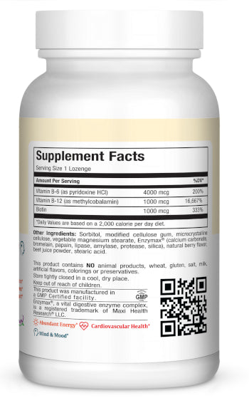 Triple B Lozenges™ are a combination of vitamin B-12, vitamin B-6 and biotin. It supports function and maintenance of the nervous system, blood cells, and protein.